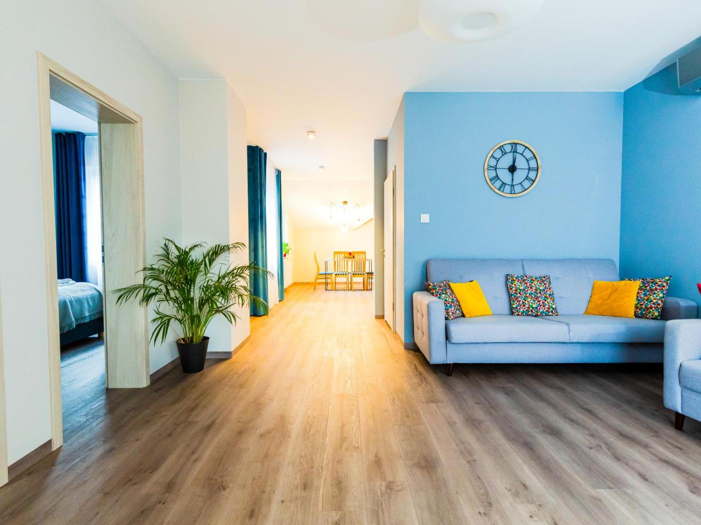 Apartament typu Deluxe Junior Suite. This spacious suite consists of 1 living room, 1 separate bedroom and 1 bathroom with a walk-in shower and free toiletries. Guests can make meals in the kitchen that is equipped with a stovetop, a refrigerator, kitchenware and a tea and coffee maker. The suite features air conditioning, a private entrance, a minibar as well as a balcony with garden views. The unit offers 2 beds. Apartament typu Suite - 4 osobowy. Powierzchnia pokoju ok.: 56 mkw. ;
