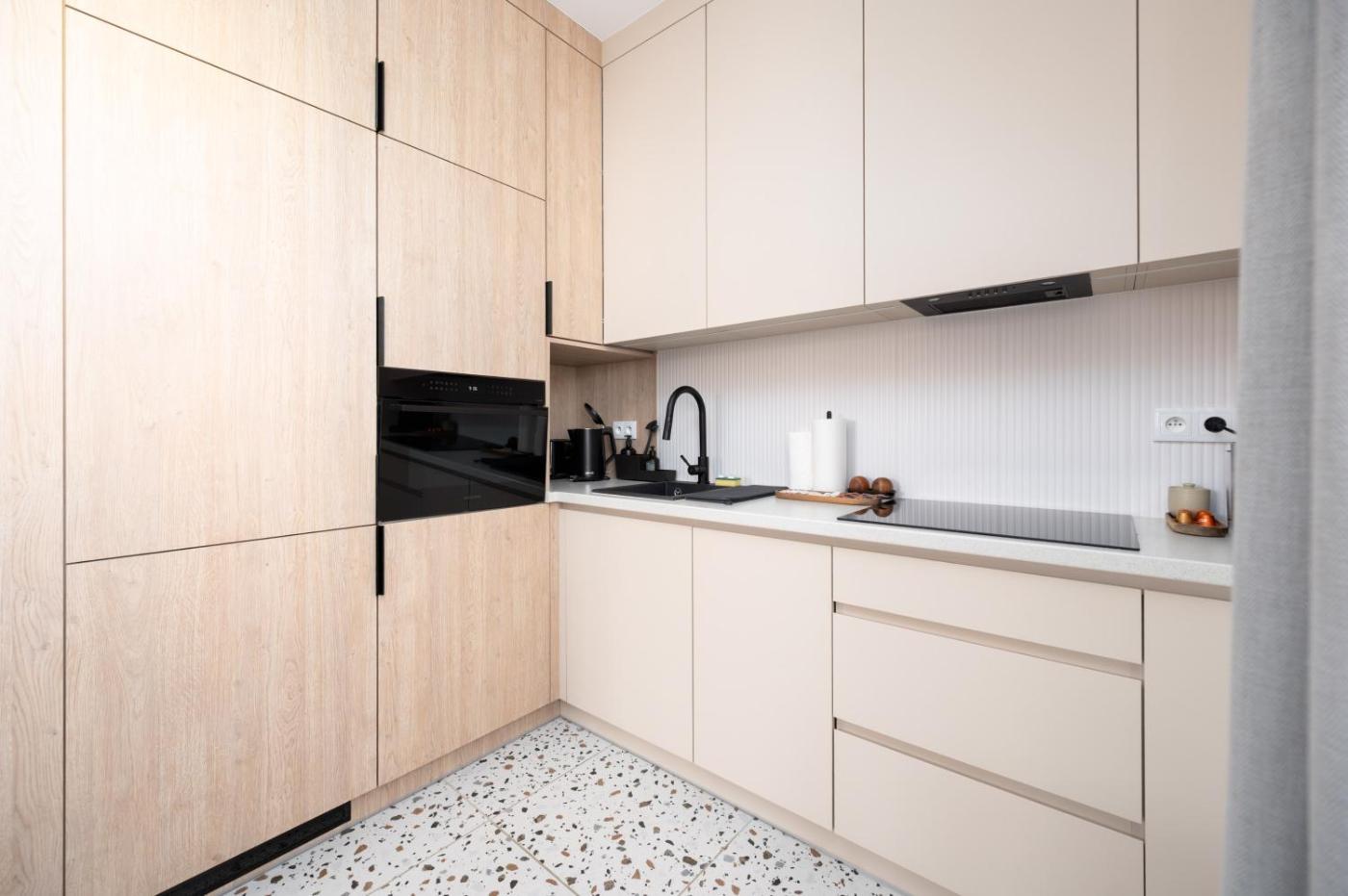 Oferta apartamentu obejmuje sypialnię (1), salon, kuchnię z pełnym wyposażeniem, w tym lodówką i ekspresem do kawy, a także łazienkę (1) z prysznicem oraz suszarką do włosów. W apartamencie zapewniono ręczniki i pościel.